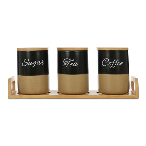 - STYLISH DESIGN: Modern kitchen canister set featuring black and beige two-tone design with elegant script lettering for coffee, tea, and sugar storage