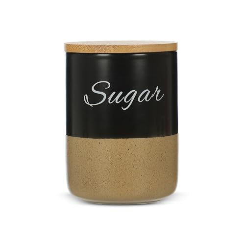 - MATERIAL QUALITY: Crafted from durable porcelain with a textured beige base and sleek black upper portion, topped with bamboo lids for secure storage
