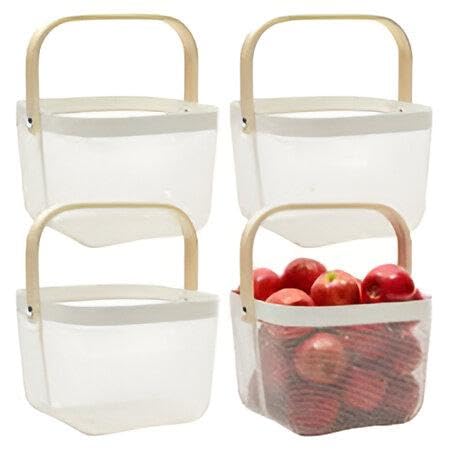 - These small, stackable white baskets with handles offer efficient space-saving solutions in addition to aesthetic appeal. They work perfectly as pantry baskets or bushel baskets, catering to the organization needs of a modern kitchen. The stackable design maximizes storage space, making them ideal for small kitchens or pantry areas where organization is paramount. Please take care when using as these durable baskets are designed to be long-lasting, but they should be kept out of extremely wet en