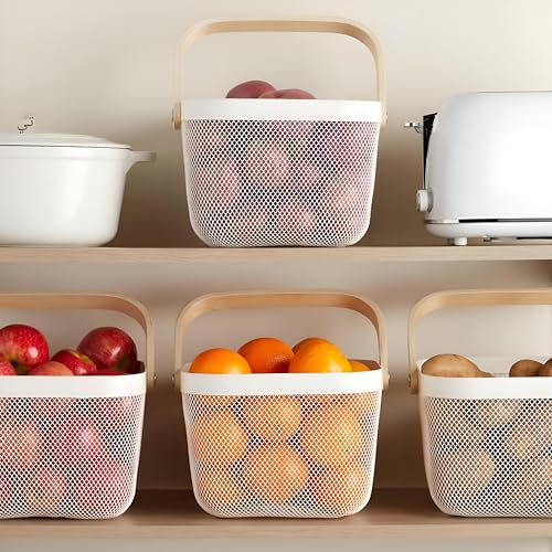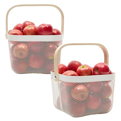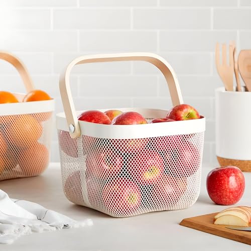 - This square metal mesh fruit basket, finished in a clean white, provides a stylish and practical solution for kitchen, pantry storage, and organization. Measuring 9.5 x 7 inches, it functions as a versatile pantry basket.