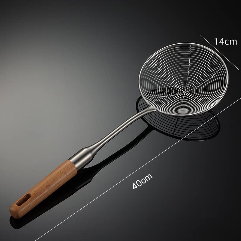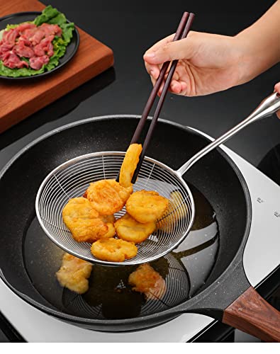- Easy to Use: The unique design increases the strainer's carrying capacity. It's faster than a fine mesh screen, maintains temperature but leaves little oil or water behind. No more need to endure high temperature and improves efficiency with fast and massive frying and cooking.