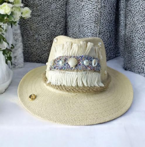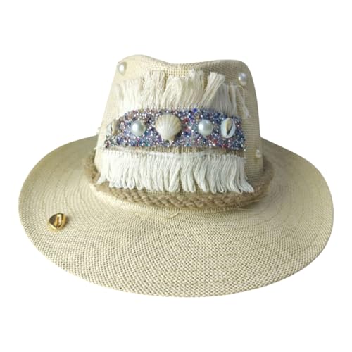 Generic - Straw Cowboy Hat for Men Women Elastic Foldable Wide Brim Sun UV Protection Beach Travel Hat Sea Shell