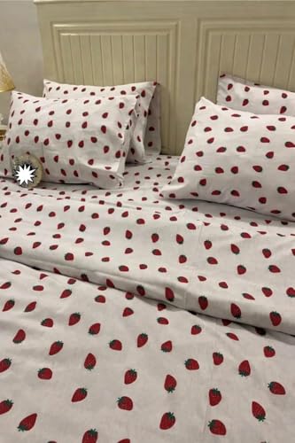 Generic - طقم غطاء لحاف بنقشة الفراولة، قطن عامرية، أبيض مع فراولة حمراء، مقاس كبير 220×240 سم مع خداديتين 50×70 سم، مزود بسوستة