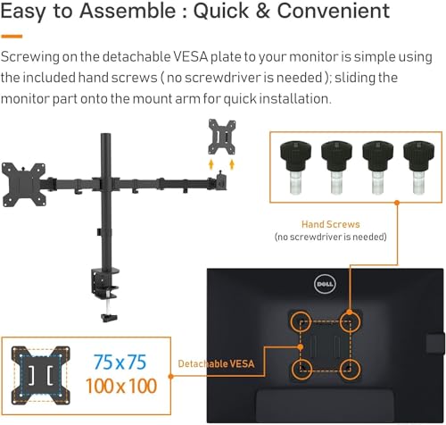 - Easy Installation: Mounting your monitors is a simple process with detachable VESA bracket plates. Keeping your desk tidy and clean. Comes complete with instructions plus all fixtures and fittings needed for simple installation.