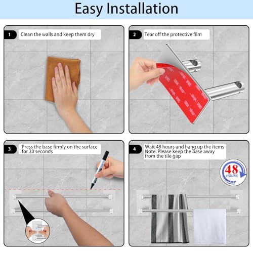 - 【تركيب ذاتي اللصق】رف مناشف بدون ثقب، تحتاج فقط إلى إزالة الغشاء الواقي، ولصق قضيب المنشفة ذاتي اللصق على سطح الحائط والضغط بإحكام. الحد الأقصى للحمل هو 12 باوند.