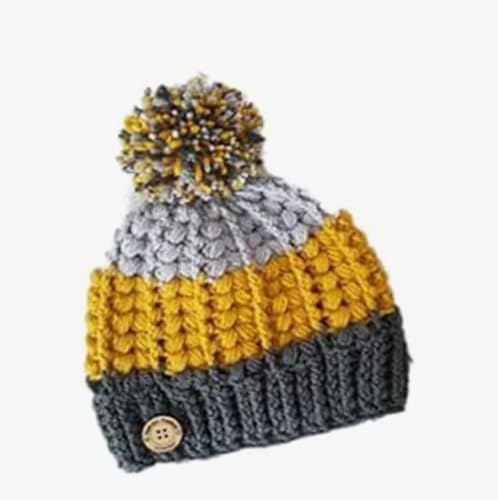 Generic - Striped Pattern Knitted Winter Hat Grey Yellow Black with Pom Pom