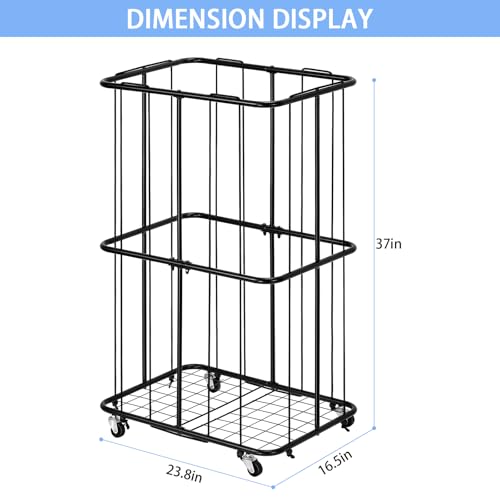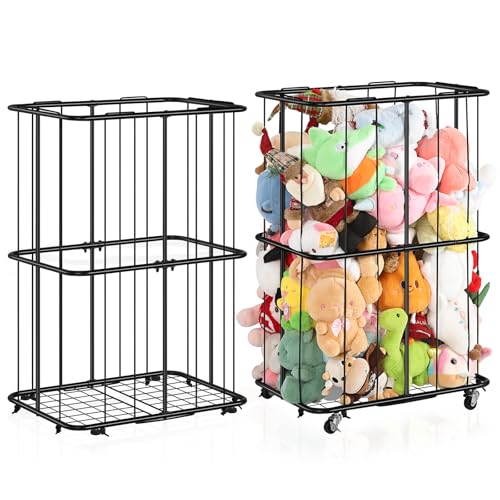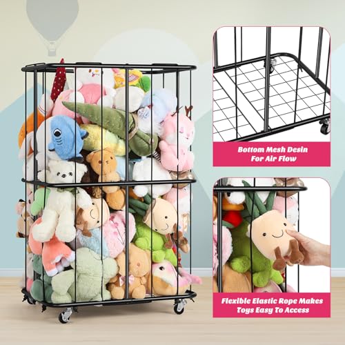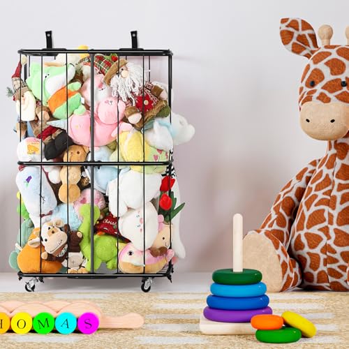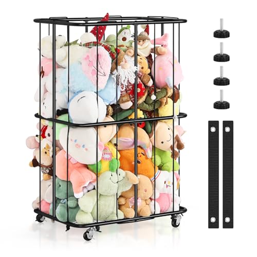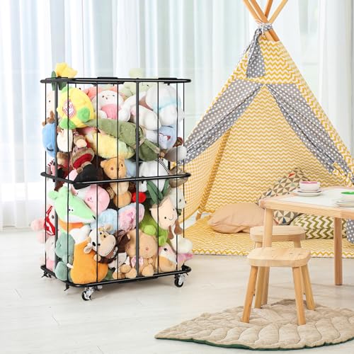 OYEAL - منظم تخزين حيوانات محشوة معدني مع عجلات وحامل تخزين للكرات، حامل تخزين مخملي مع شريط مطاطي لغرفة اللعب وغرفة النوم، سهل التجميع، اسود