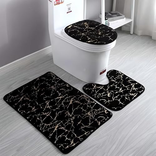 Generic - Stylish Bathroom Accessories - 3 Piece Marble Non-Slip Mat Set, Includes Toilet Lid Cover and Washable Bath Mat, Perfect for Modern Bathroom Style (Black)