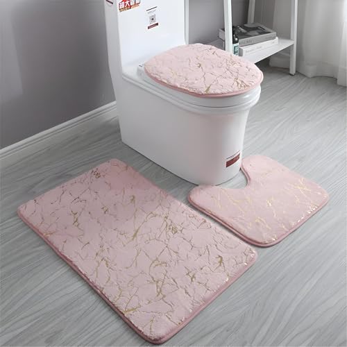 Generic - Stylish Bathroom Accessories - 3 Piece Marble Non-Slip Mat Set, Includes Toilet Lid Cover and Washable Bath Mat, Perfect for Modern Bathroom Style (Pink)