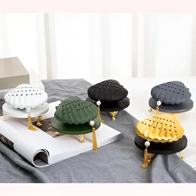 - The Oud Bakhoor Incense Burner features a unique metal seashell design in a sleek black color, making it an elegant addition to any space. Its artistic appearance not only serves as a functional incense holder but also enhances the aesthetic of your home decor.