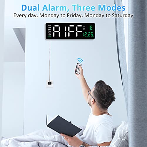 - 【ساعة منبه مزدوجة وغفوة لمدة 5 دقائق】 يمكن لساعة الحائط الرقمية ضبط ساعتي منبه، يوجد ثلاثة أوضاع لساعة المنبه: "ساعة منبه يومية"، "ساعة منبه من الإثنين إلى الجمعة"، "ساعة منبه من الإثنين إلى السبت"، تلبي الأوضاع المختلفة احتياجاتك المختلفة. تتميز ساعة المنبه بمدة غفوة 5 دقائق. عندما يصدر صوت المنبه، اضغط على أي مفتاح لإنهاء المنبه.