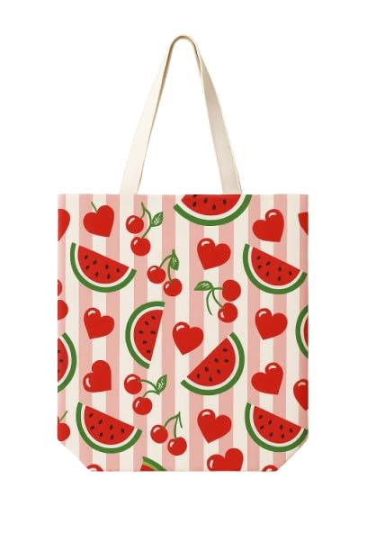 Generic - Summer Fruit Pattern Canvas Tote Bag, Watermelon and Cherry Print, Pink and White Stripes