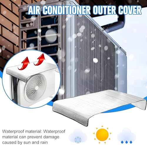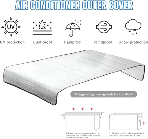 - This air conditioner outdoor unit cover provides comprehensive protection against the elements, extending the lifespan of your AC unit and ensuring optimal performance. Constructed from high-quality, reflective aluminum foil, it acts as a shield against harsh sunlight, rain, dust, and other environmental factors, preventing damage and maintaining peak operational efficiency. By reflecting sunlight, the cover minimizes heat absorption, placing less strain on the unit and reducing the need for exc
