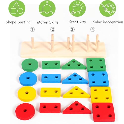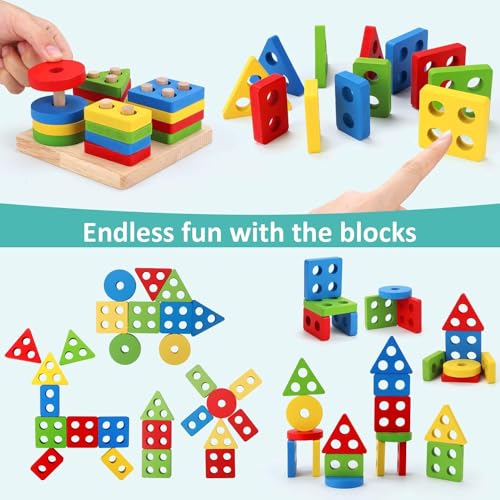 - Multi-play with wooden sorting stacking toy: it can build, stack, and thread it, learn shapes and colours, from large to small, from red to blue, the right shape into the right pens. Or build it in cute patterns to learn objects. An excellent educational toy for young children.