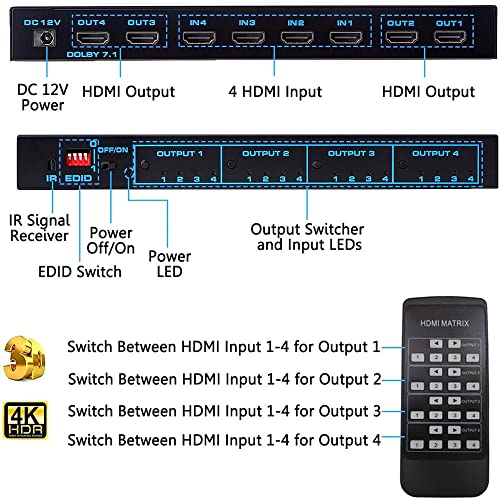 - * Matrix function: Four HDMI output ports independently select one of four HDMI inputs to achieve a different display.