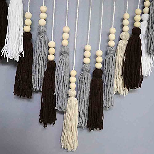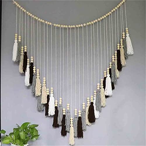 SWECOMZE - مكرمية بخرز خشبي كبير بشراشيب للتعليق على الحائط بنمط بوهيمي طبيعي من سويكومز، بساط مكرمية لديكور حفلات الزفاف (بيج رمادي)