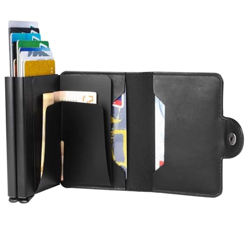 - 【Quick Access Cards】: Our pop up wallet just gently pushes the bottom button of the credit card holder, and the card will pop up in layers, and you can easily find any card you want from your credit card wallet.Double aluminum cases for 12 standard-sized cards, extra 2 slots for credit card/bank card/business card or a few cash, with built-in money clip.