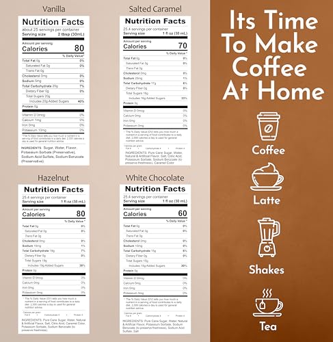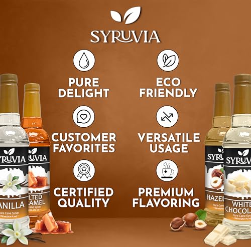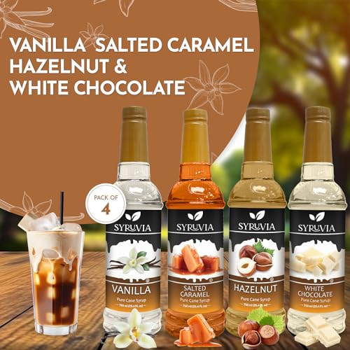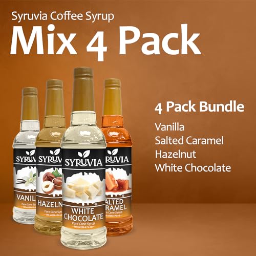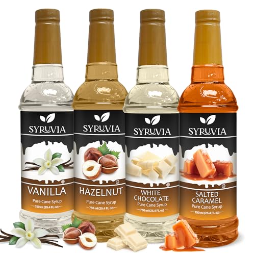 - Experience a symphony of flavors with our Syruvia Coffee Syrup Delightful Quartet. With luxurious Vanilla, indulgent Salted Caramel, decadent Hazelnut, and creamy White Chocolate, each 25.4 fl oz bottle adds a new dimension to your coffee ritual, creating a truly blissful brew!