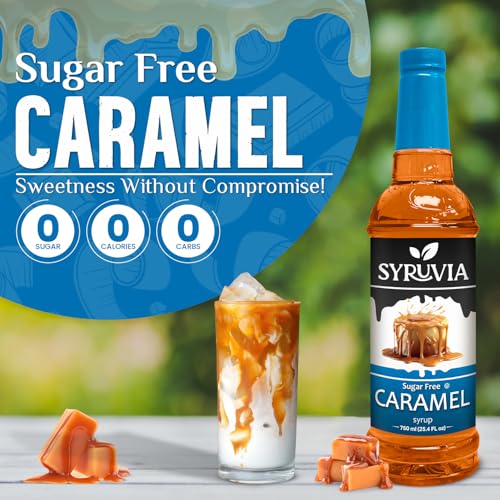 SYRUVIA - شراب كراميل خالي من السكر مع موزع مضخة شراب - بنكهة شراب القهوة والكراميل من سيروفيا، 25 اونصة سائلة، كوشر، خالي من الجلوتين، مثالي للقهوة والمشروبات الغازية والحلويات وغيرها