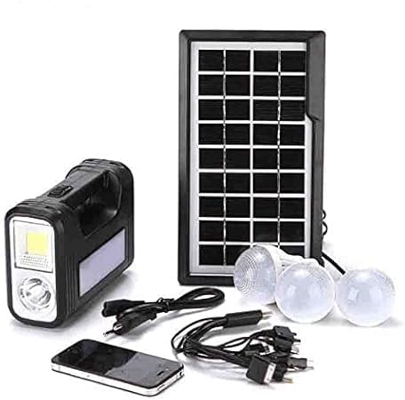 - This solar lighting system is great for camping, traveling, outdoor activities, or power outages. Never stay in the dark again. It comes with 3 bulbs to connect them to the battery and that you illuminate your home, farm, cellar, or the place you need. You can recharge the kit's battery by connecting it to the electrical current or by placing the panel in the sun. In addition, it has three powerful built in flashlights 2 front 1 side so you never lack light.
