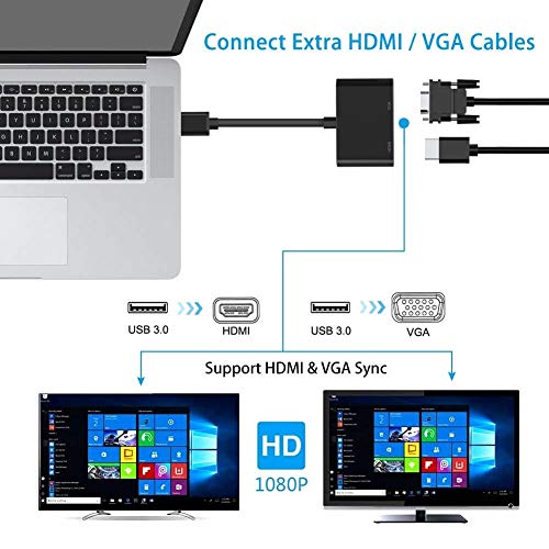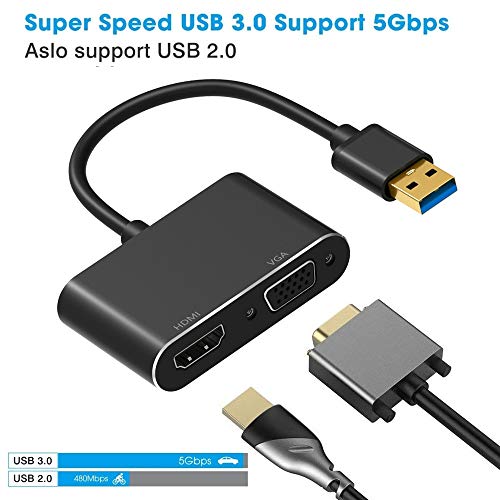 - 【USB3.0 to HDMI VGA Dual Output】 This USB3.0 to HDMI VGA adapter supports to connect with two external monitors at the same time.The images showed on the two external monitors will be the same.