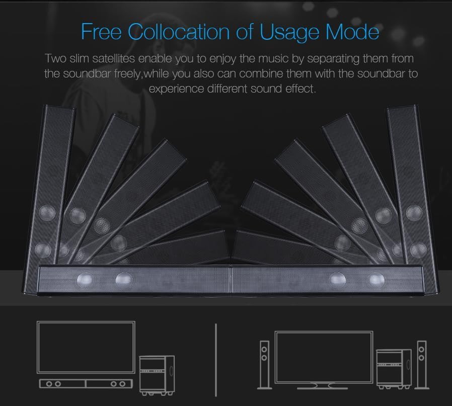 - Free Collocation of Usage Mode, Two slim satellites enable you to enjoy the music by separating them from the soundbar freely,while you also can combine them with the soundbar to experience different sound effect.