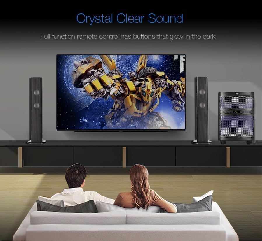 - High Density Wood Subwoofer , Pure wood bass cabinet delivers lush, yet natural sound quality ،Crystal Clear Sound , Full function remote control has buttons that glow in the dark.
