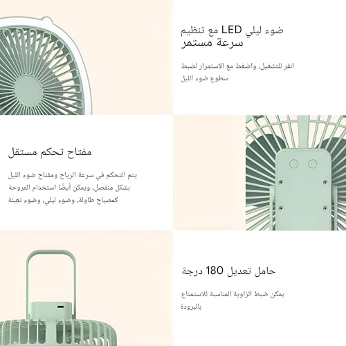 - مصممة من أجل الهدوء، تعمل هذه المروحة بسلاسة دون ضوضاء مزعجة، مما يجعلها مثالية لبيئات مثل الدراسة أو النوم أو ممارسة اليوغا أو العمل، بينما يعزز الخطاف القابل للطي والتصميم خفيف الوزن إمكانية الحمل للاستخدام في الهواء الطلق.