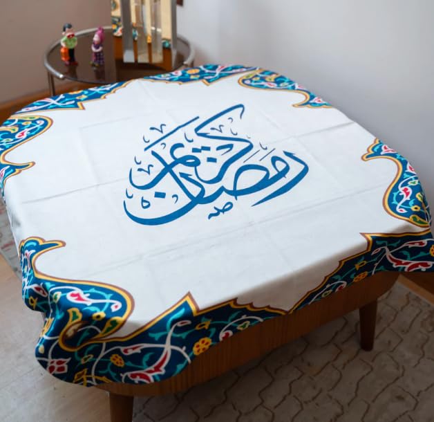 Generic - Tablecloth with Arabic Calligraphy, White with Colorful Border, Velvety Soft Fabric, Multiple Sizes Available, Dining Table Cover for 6-8 People (90 * 90)