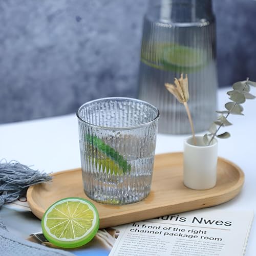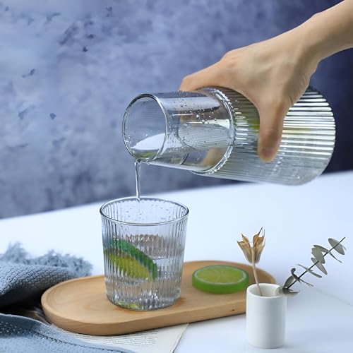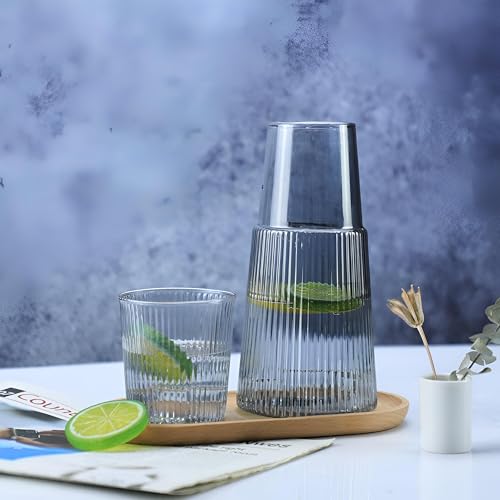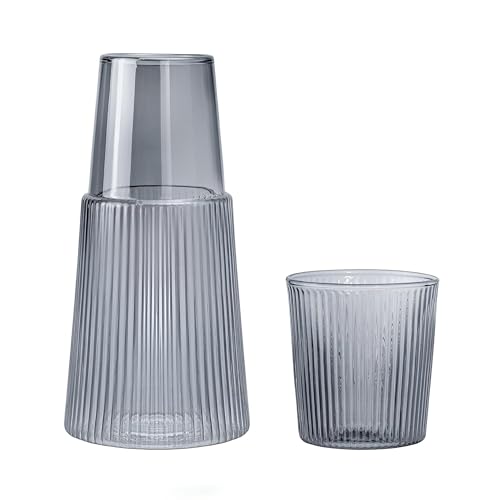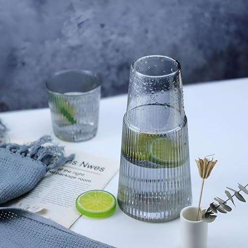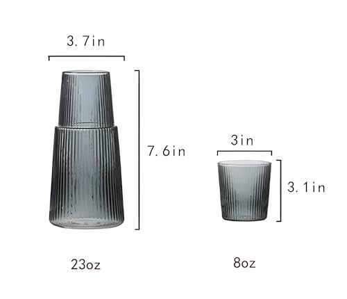- Aesthetic and decor value: not just a practical pitcher and cup but also a tasteful decor addition; its gray hue, transparent glass, and vertical ribbing complement various decor styles and create a calm, sophisticated bedside vignette.