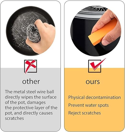 - 【No Scratches】General cleaning products directly wipe the surface of the pot body, causing scratches directly, while the artifact eraser uses physical spot removal to prevent water spots, protect the protective layer of the pot body, and reject scratches.