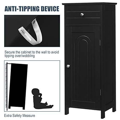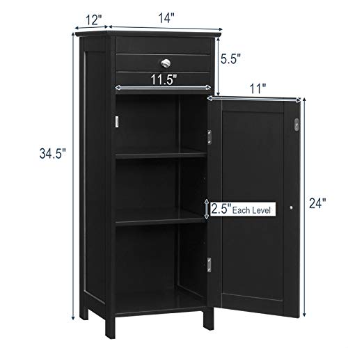 Tangkula - Tangkula Bathroom Floor Cabinet, Wooden Side Storage Organizer, Free-Standing Single Door Floor Storage Cabinet with Large Drawer & 2 Adjustable Shelves for Living Room Kitchen (Black)