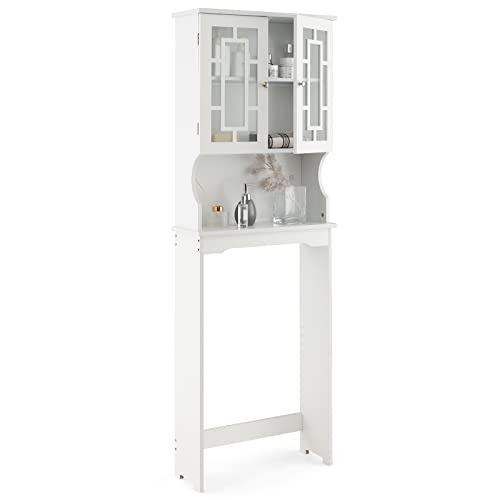 Tangkula - Tangkula Over The Toilet Storage Cabinet, Freestanding Over Toilet Storage Rack w/ 2 Tempered Glass Doors, Open Shelf, 3-Position Adjustable Shelf, Space-Saving Bathroom Organizer (White)
