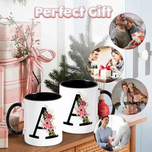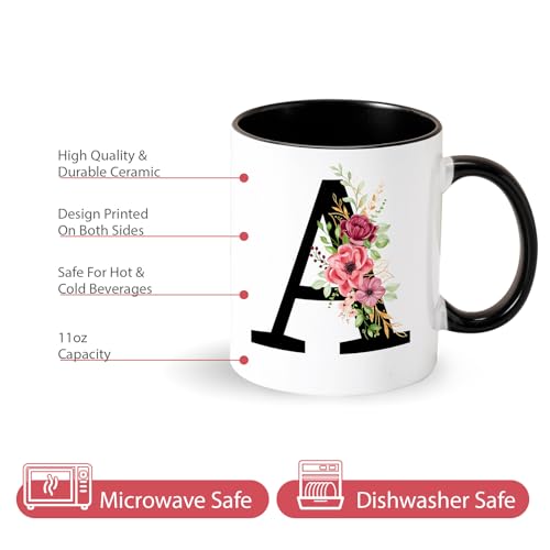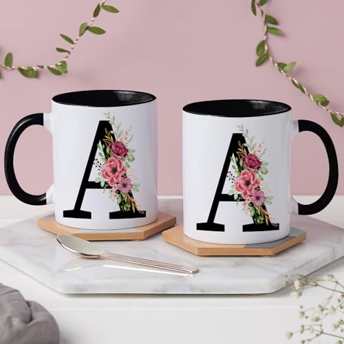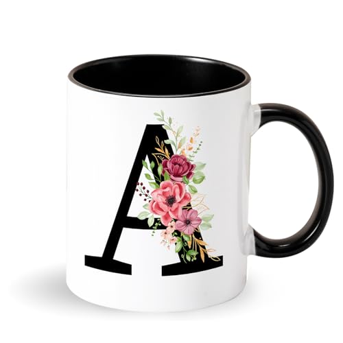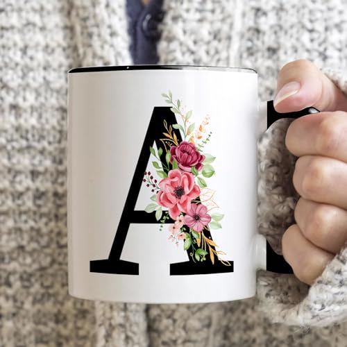 - Tarklanda Personalized Initial Mug With Letter and Flowers - 350ML Porcelain Black Coffee Mug - Original Gifts for Women, Birthday and Christmas Presents (A)