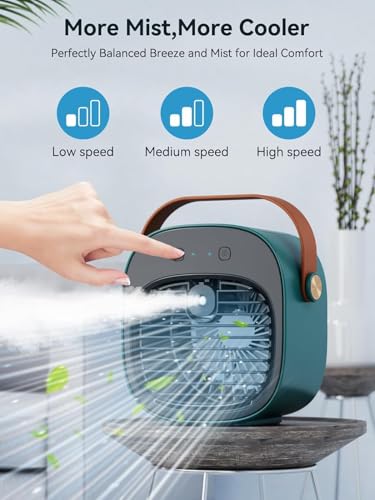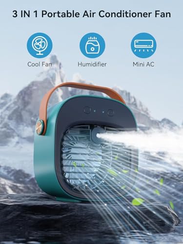 - ❄️【Rechargeable Portable Fan and 4000mAh】: Our Mini Air Conditioner is truly wireless and portable design, small size, won't take up much space, and can be easily carried. Portable air cooler with power bank, 4000mAh power bank works for 5-10 hours, no need to worry about power failure. The cold air can be sprayed continuously for several hours to keep the body cool and achieve a good night's sleep.