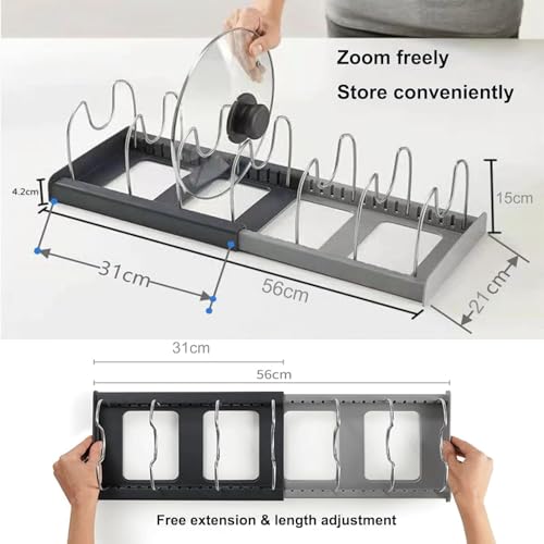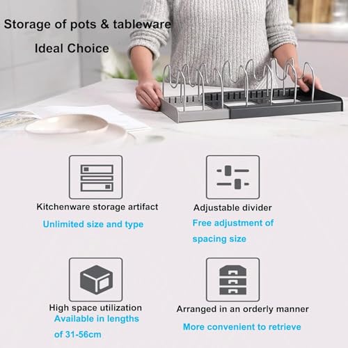 - ✅ 【استخدام متعدد الوظائف】: مناسب لتخزين مجموعة كبيرة من أدوات المطبخ مثل أواني الطهي وطاسات القلي وألواح التقطيع والأطباق وأدوات الخبز. تسمح الدعامة القابلة للتوسيع بسهولة التمدد من مقاس 31×21 سم إلى 56×21 سم، مما يجعله مناسب لمجموعة متنوعة من مساحات المطبخ.