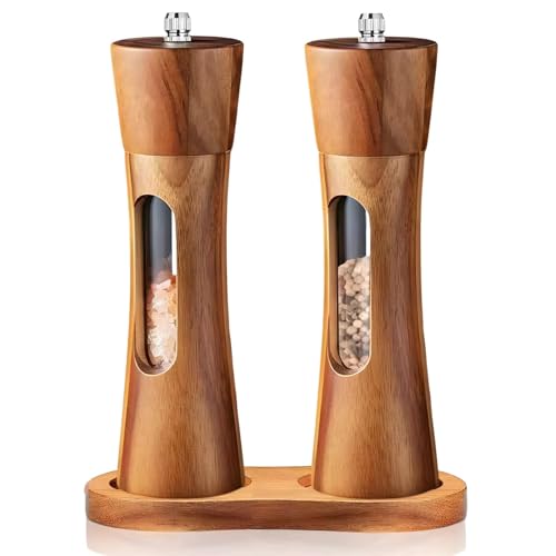 - ✅【Elegant and Practical】: Includes a stylish wooden base with two grooves; neatly holds both grinders; transparent windows allow easy viewing of spice levels; perfect gift packaging.