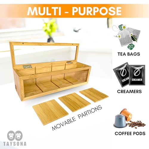 TAYSONA - Tea Bag Organizer - Tea Organizer - Tea Storage Box with 4 Compartments (13.5" x 4" x 4.1") - Magnetic Lid & Clear Acrylic Window - Made of Bamboo - Keeps Tea Fresh - Perfect Gift for Tea Lovers