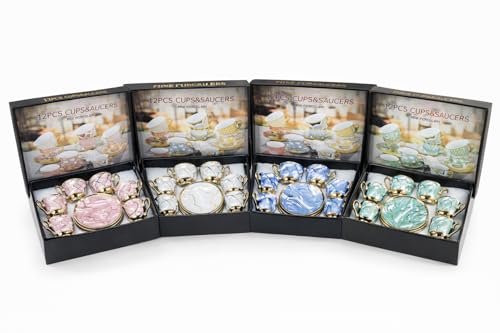 Generic - طقم أكواب شاي مع صحون، بورسلين فاين، تصميم رخامي، لمسة ذهبية، 12 قطعة