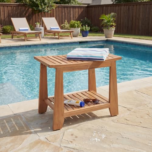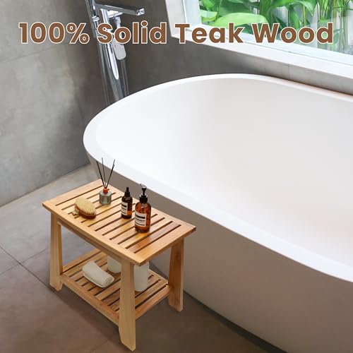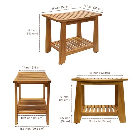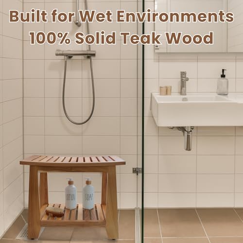 TEAKAURA - مقعد استحمام من خشب الساج مقاوم للماء مقاس 21 انش مع رف تخزين، كرسي حمام من خشب الساج الصلب غير قابل للانزلاق للحمامات الصغيرة داخل الدش والاستخدام الخارجي من تيكورا