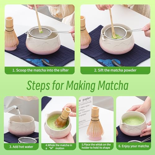 - 7-PCS MATCHA WHISK SET PINK: 1*Ceramic Bowl (chawan) 560 Ml/18.9 Oz, 1*Bamboo Whisk, 1*Bamboo Scoop (chashaku), 1*Cermaic Whisk Holder, 1*Ceramic Scoop Stand, 1*Cotton Tea Cloth (chakin), 1*Matcha Powder Sifter.includes All Accessories