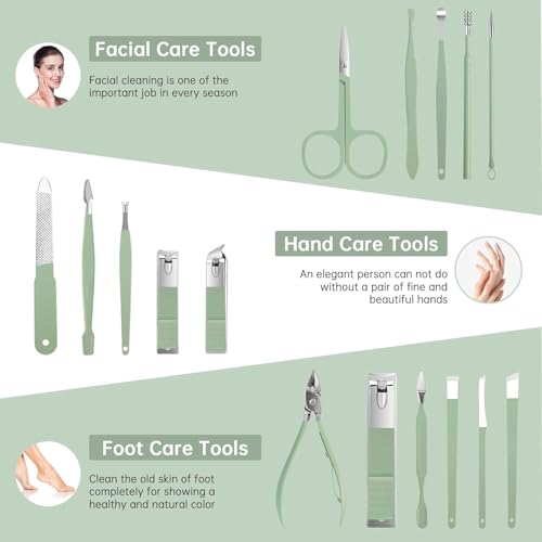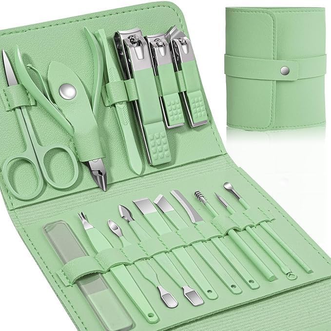 TECHZONE - TECHZONE Premium 18-Piece Manicure & Pedicure Set with Leather Case – Nail Clippers, Scissors, Cuticle Tools, Nail File & More – Travel Grooming Kit (Green)