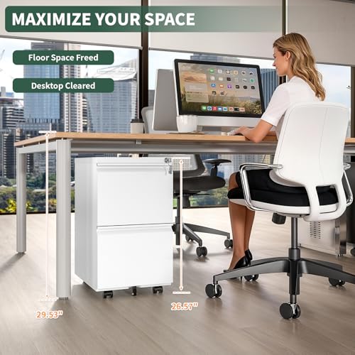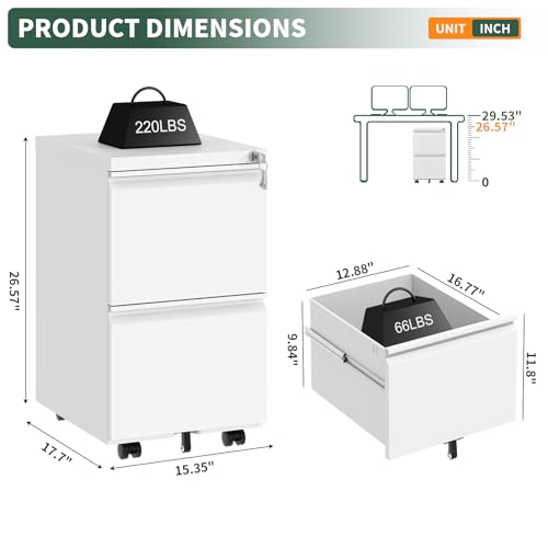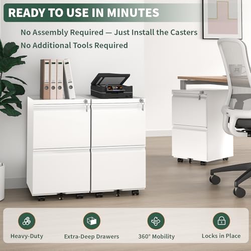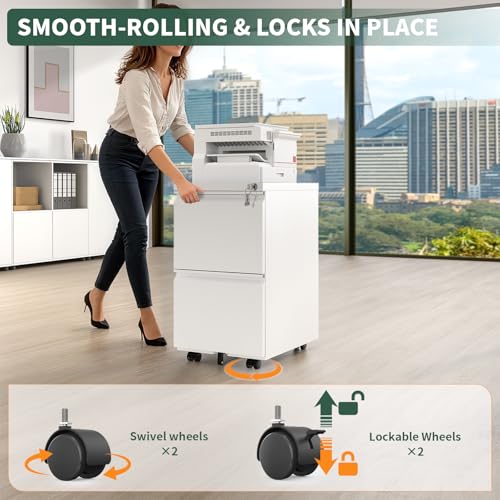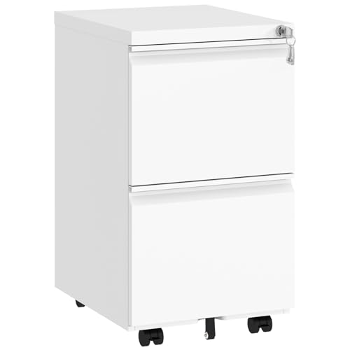 TEEALUBAN - خزانة ملفات بدرجين وقفل أمان، خزانة مكتبية صغيرة بعجلات لمنطقة أسفل المكتب، خزانة معدنية متنقلة للمكاتب المنزلية تأتي مجمعة بالكامل من تيالوبان، لون أبيض