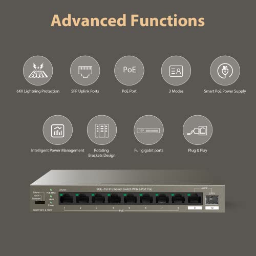 - 【𝗦𝗠𝗔𝗥𝗧 𝗣𝗢𝗘 𝗣𝗢𝗪𝗘𝗥 𝗠𝗔𝗡𝗔𝗚𝗘𝗠𝗘𝗡𝗧】PoE switch 8 port equipped with an intelligent power management chip, when the powered device exceeds the rated power (92W) of the PoE switch, the low priority ports are automatically powered off, avoiding equipment overrun and extending equipment life