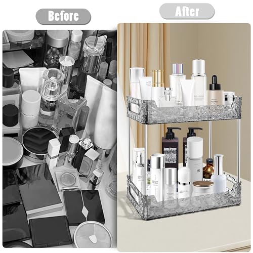 - 【Large capacity Size】2 tier bathroom countertop organizer is 6.29*10.23*10.8 inch.Large capacity, perfect size, enough height, 8.07 inches of layer spacing can be placed higher items.Vanity Organizers And Storage Can Hold Skincare,Makeup,Beauty Tools And Other Related Items