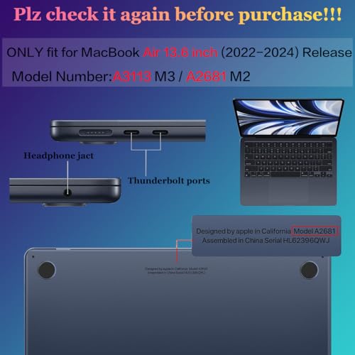 - 【حافظة لجهاز ماك بوك اير 13.6 انش】 - متوافقة فقط مع ماك بوك اير 13.6 انش إصدار 2022 2023 2024 مع شاشة ليكويد ريتينا M3/M2 وخاصية تاتش اي دي، الموديل: A3113/A2681.