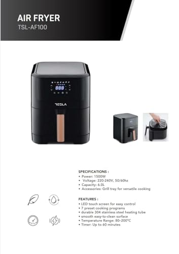 Generic - Tesla TSL-AF100 Air Fryer Without Oil - 6 Liter Capacity, Digital Touch Screen, 1500 Watts, 7 Cooking Programs, Timer and Heat Control, Black