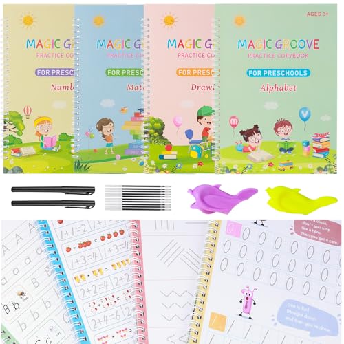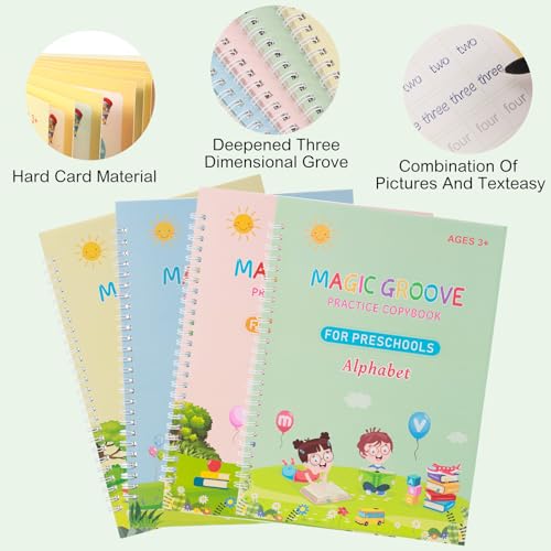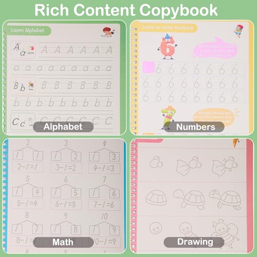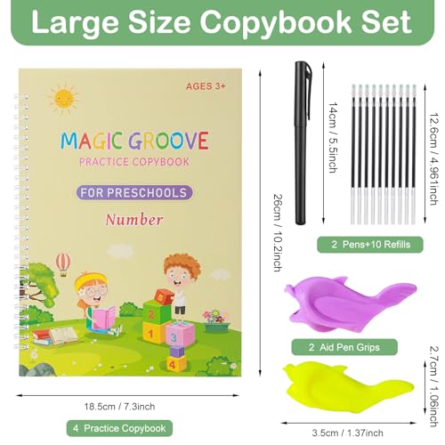 - مجموعة دفاتر النسخ السحرية: تحتوي العبوة على 4 كتب تدريبية للأطفال (لتعليم الحروف الأبجدية، والأرقام من 1 إلى 100، والجمع والطرح، والرسم)، قلمين، أداتين مساعدة لمسك القلم، 10 أنابيب إعادة تعبئة، وهي الكمية الكافية لتلبية احتياجاتك.