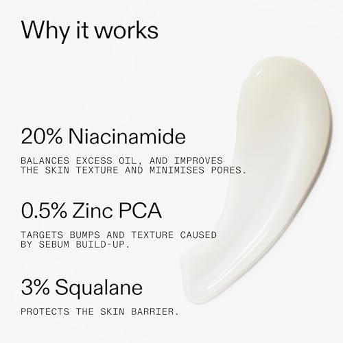 - مكونات قوية - تم إنشاء هذه التركيبة بالشراكة مع أطباء الأمراض الجلدية، حيث تحتوي على أعلى نسبة من النياسيناميد، مما يساعد على تقليل إفراز الزيوت الزائدة طوال اليوم وشد مظهر المسام المتضخمة بفعالية؛ تشمل المكونات الرئيسية الأخرى؛ الزنك بي سي ايه الذي يستهدف تراكم الزهم والسكوالين لحماية حاجز البشرة.