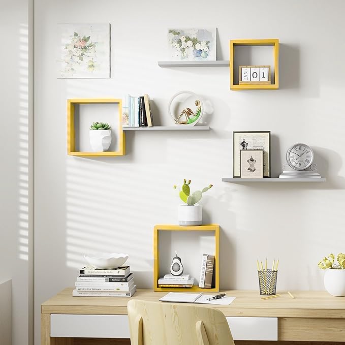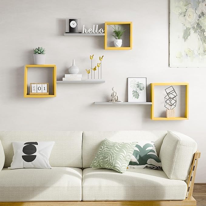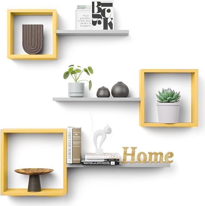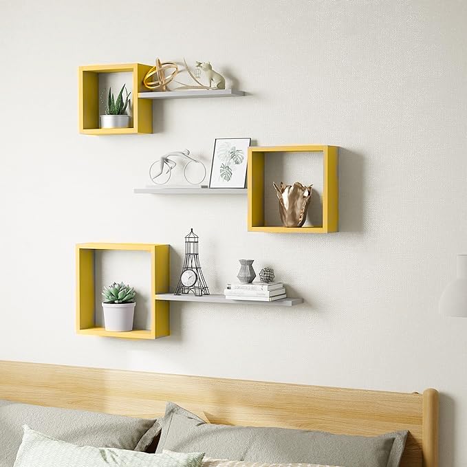 The Menifest - Modern Cube Wall Shelves – Floating Storage & Display Units for Wall Decor Stylish Cube Wall Shelves Set – Perfect for Home & Office Wall Decor (Yellow & Grey)